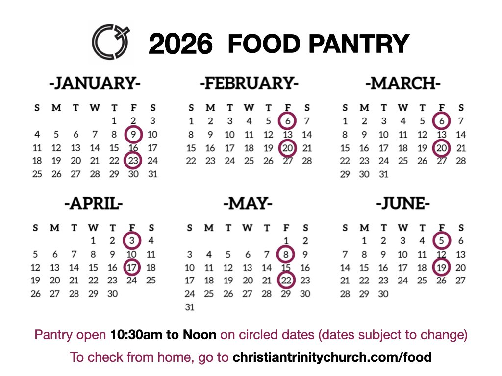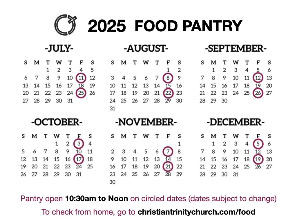 Our Emergency Pantry is on the calendar dates below from 10:30am to noon with no appointment needed to help our Eastpointe residents get back on their feet. You can see the schedule below if you are wondering which week we are on. We provide physical food and spiritual food for those in need. Since we are an emergency pantry, we ask that you come only once a month. Thank you. (dates subject to change)